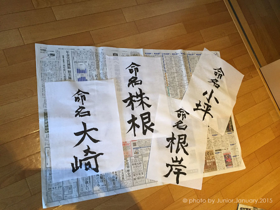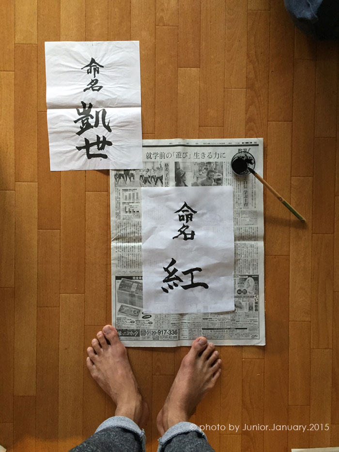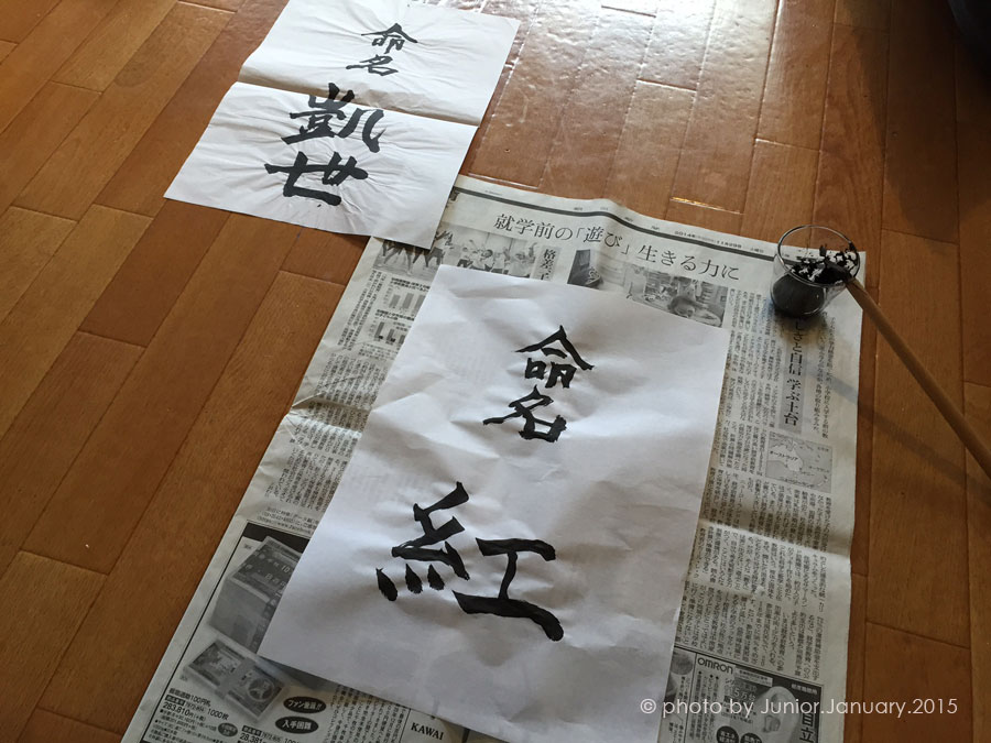 暴れん坊の昼寝中を狙って墨汁と筆を取る お七夜の命名