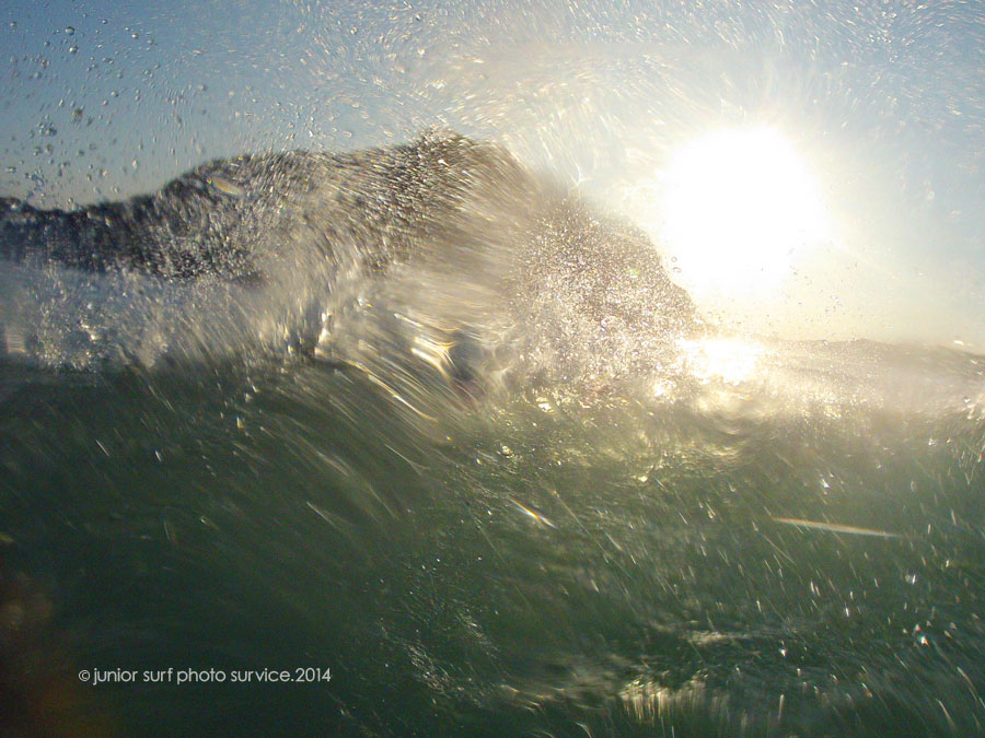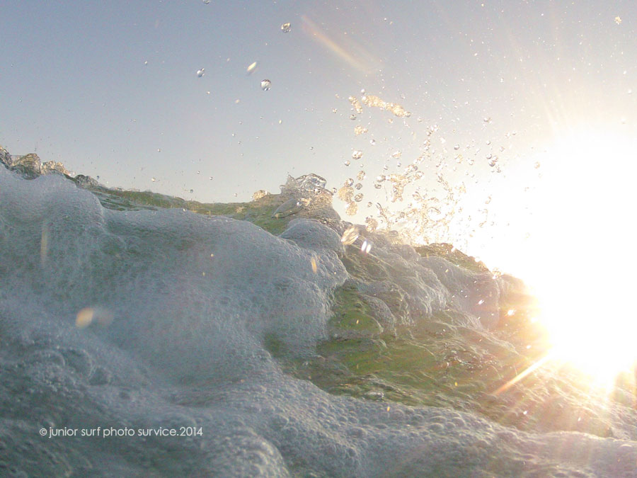 Takaちゃんがテイクオフ 水しぶきと太陽と岬 浅いリーフと待ち構えるウニ