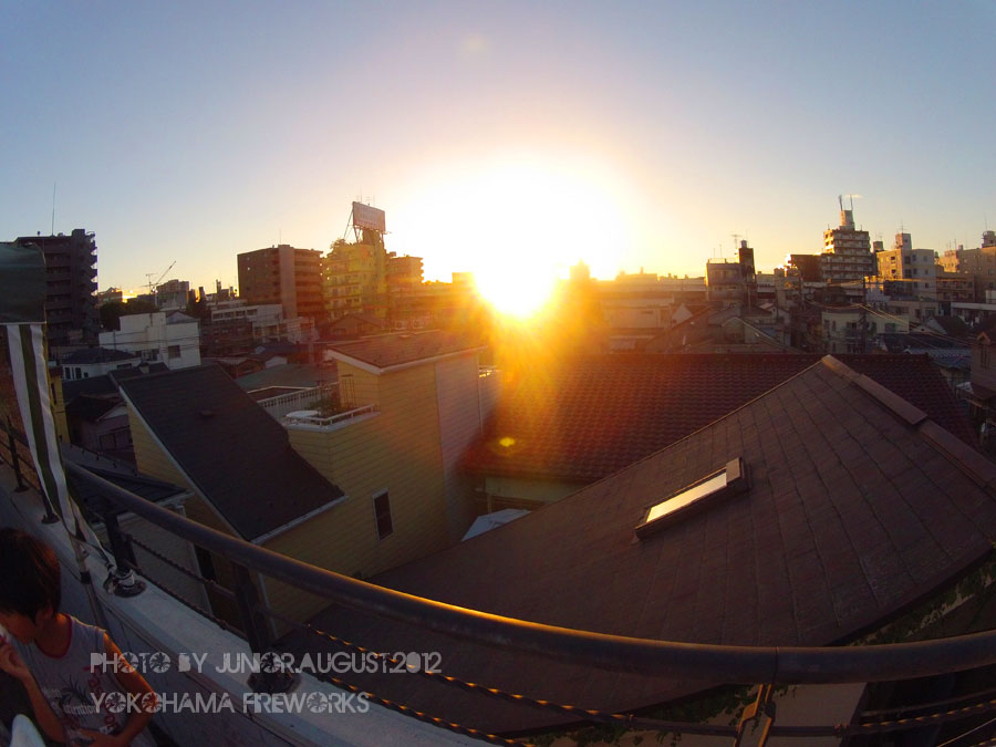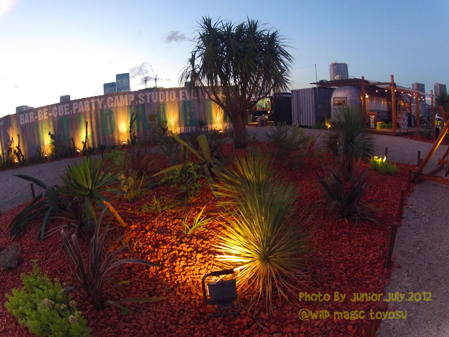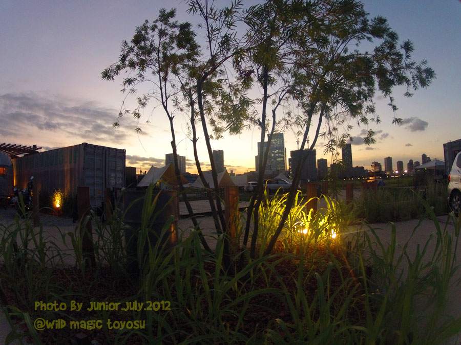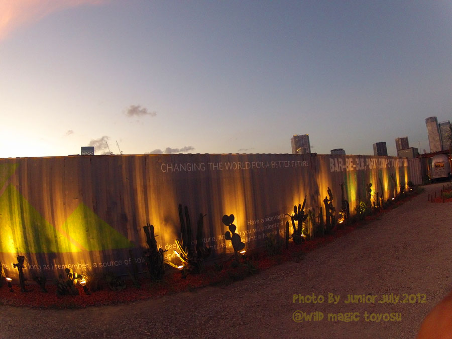 陽が暮れると同時にハイセンスに並べられたコンテナがライトアップされる