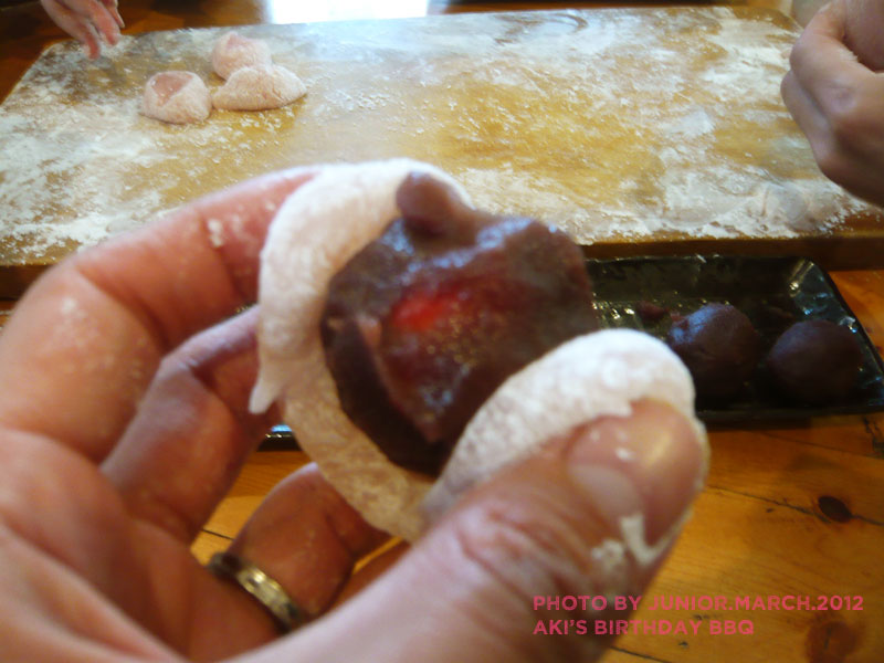 熱いもちもち生地に苺と漉し餡を包む