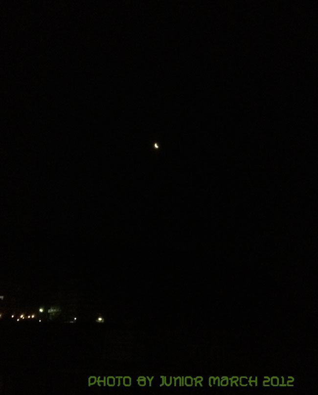 ……5:12am 小さな漁港町に到着 街頭と三日月が寂しく輝く
