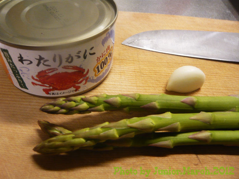 蟹缶詰、アスパラ、大蒜一片、鷹の爪