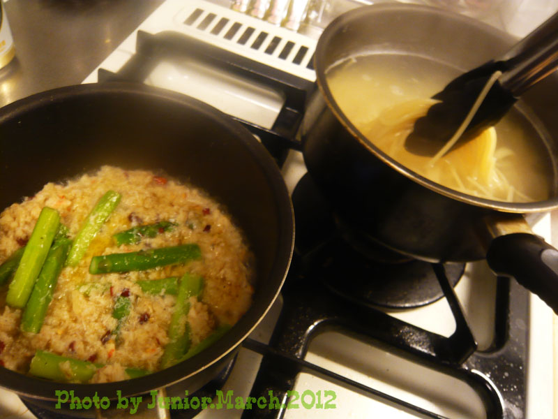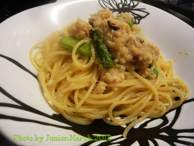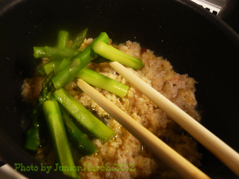 La Espanolaをひいて大蒜、香り出たら蟹缶投入 アスパラも頃合い見て投入