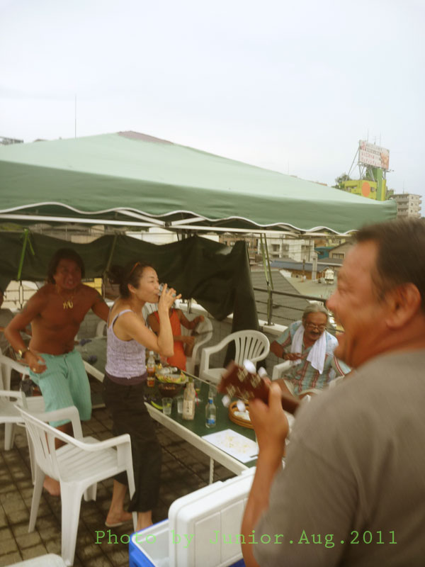 Ukulele Jun-sanの乾杯音頭で60°の花織酒を順番にあおっていく