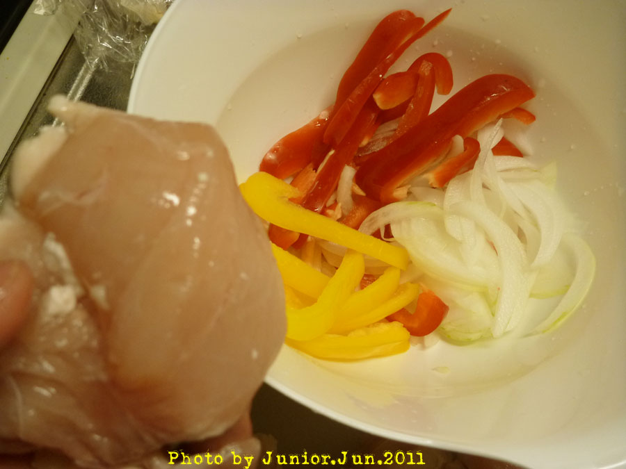 叩き売りされていた鶏むね肉 パプリカ各種を切り 玉葱はさらしておく