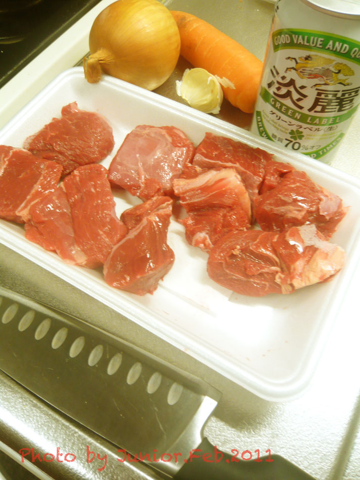 安売り牛肩肉は常温に戻して塩で下味つけて玉葱縦スライス人参は1cm輪切りに