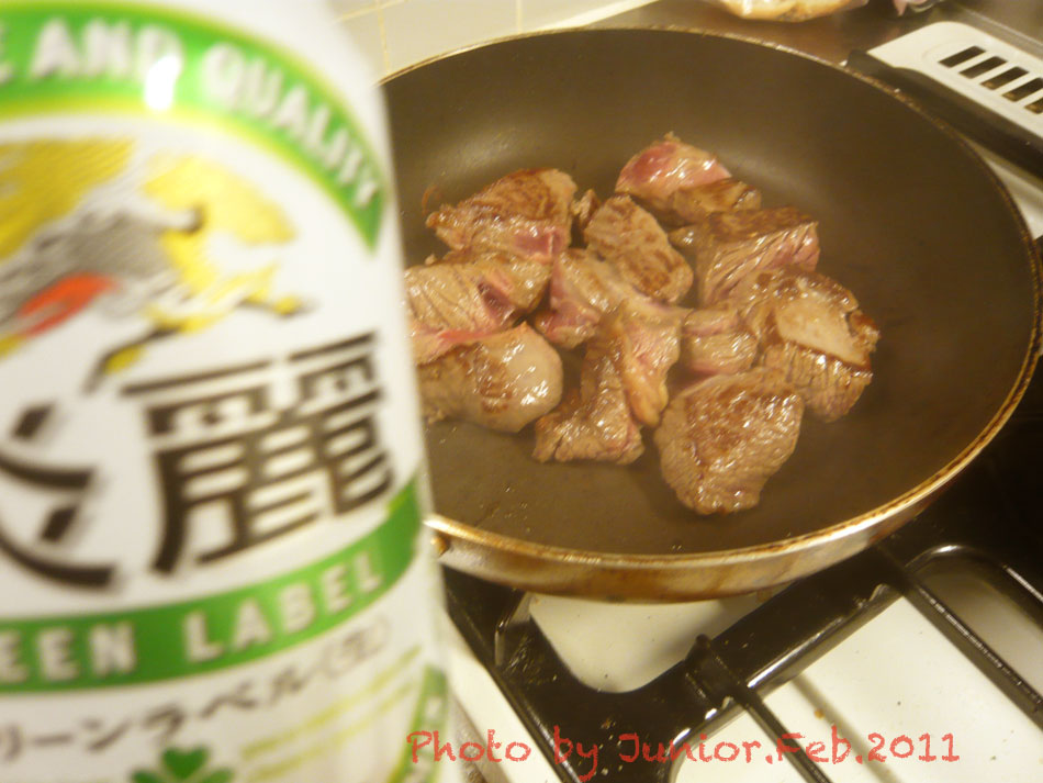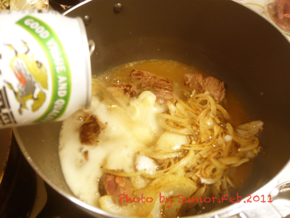 鍋にビールを一本加え大蒜、ブイヨン1片、200ccの水に塩小①、砂糖小①、胡椒適量投入