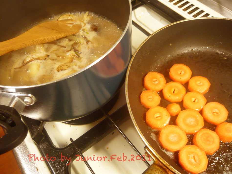 横で人参をバターで炒めて、艶が出たら鍋に加える