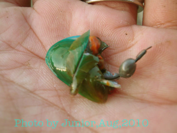 現地採取したカラス貝も反応ない ふと見ると緑カラス貝が。