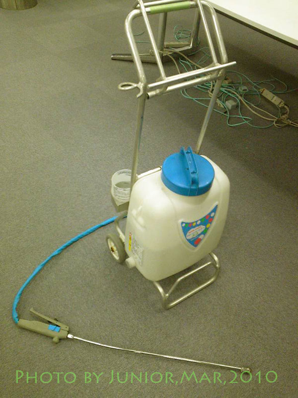 噴霧機でカーペットに撒いていく
