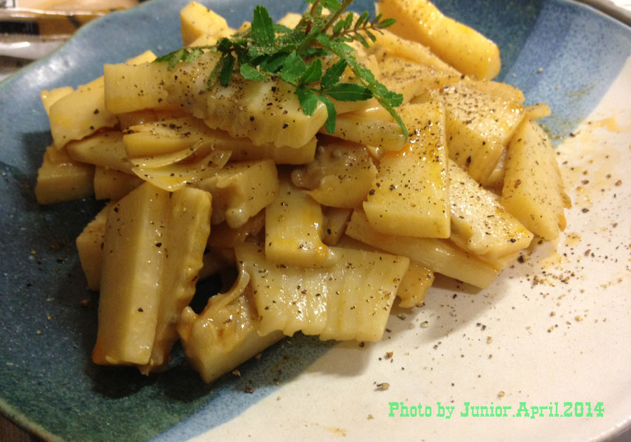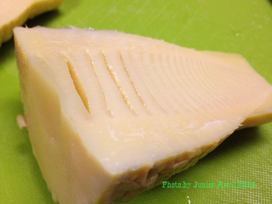 下茹でしてある筍を胡麻油で軽く炒めたら水Cup2、味覇大さじ1、砂糖小1投入