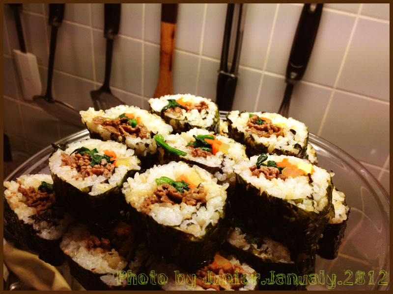 胡麻油ベースのシャリにナムル的な具に玉子と牛肉プラスして韓国海苔で巻く
