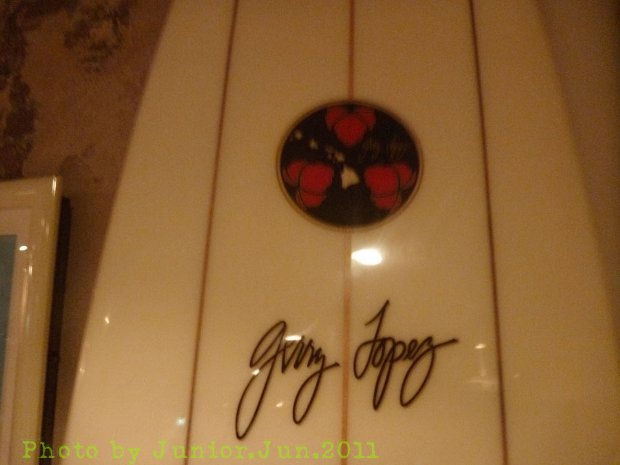 Gerry Lopez先生の板が飾られ空間にアクセントと海の香りを添える