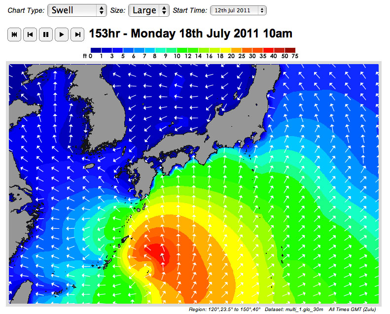 東〜南東〜南〜南西に 徐々にシフトしながら強まっていくうねり...
