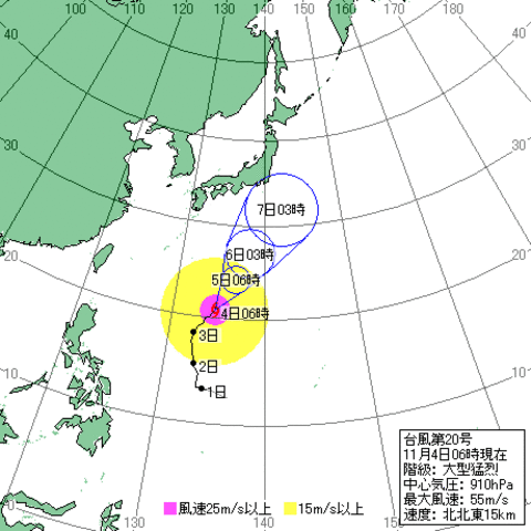 Super Typhoonにまで発達した20号も前線の影響と真東に近いうねりの向きで